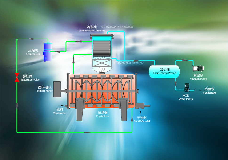 蒸發室在真空系統的作用下,負壓維持在-95——97KPa,物料在負壓作用下自動吸入蒸發室,同時熱泵系統將換熱裝置形成蒸發與冷凝兩部分,蒸發室內設置刮板和夾套式蒸發器,連續攪動物料在夾套式換熱器表面形成蒸發層,物料中的水分蒸發形成水蒸氣,然后上升至冷凝換熱器凝結為冷凝水,冷凝水自流至冷凝水罐自動排放,蒸發室最終的干物質在刮板作用下排出設備。